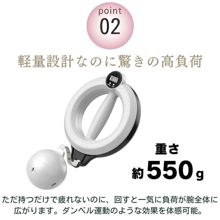 器具本体はわずか約0.45kg。片手でもラクに持てる軽さなのに、吊り下げられた約0.15kgのウエイトボールが回転することで、二の腕から前腕まで継続的に刺激。