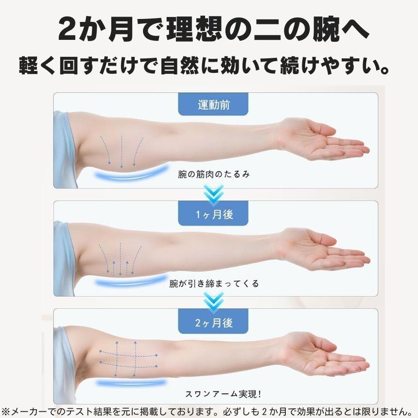 器具本体はわずか約0.45kg。片手でもラクに持てる軽さなのに、吊り下げられた約0.15kgのウエイトボールが回転することで、二の腕から前腕まで継続的に刺激。