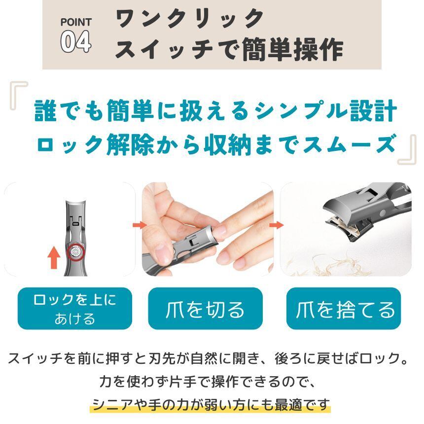 従来の爪切りでは刃の開きが小さく、分厚い爪を無理やり挟んで切ることで刃が欠けたり、爪が割れてしまうことも。本製品は刃が大きく開く設計のため、分厚い爪もしっかり挟み込み、力を入れずスムーズにカット可能。シニアの方や爪が硬い方にも最適です。