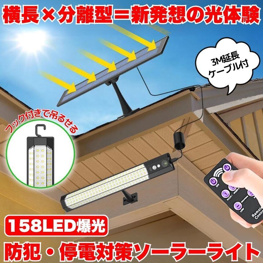 太陽が届かない場所にも、しっかり光を。<br>【分離型ソーラー防犯ライト】は、<br>従来の一体型では届かなかった場所にも明るさを届ける新発想の防犯ライトです。<br><br>ソーラーパネルとライト本体を分離できる設計により、<br>日当たりの悪い玄関やガレージ下、ベランダ、通路などでも安心。<br>パネルは日当たりの良い場所に、ライトは好きな位置に設置可能です。<br>付属の約3mケーブルで自由なレイアウトを実現しました。<br><br>さらに、120度高感度センサー搭載。<br>人の動きを広範囲にキャッチして自動点灯し、不審者の侵入を未然に防ぎます。<br>帰宅時や夜間の作業時も、自動でパッと点灯して手間いらず。<br>暗闇で鍵を探すストレスももうありません。<br><br>また、高輝度158個LEDチップを搭載し、3面発光で照射範囲は圧倒的。<br>よくある縦型デザインではなく、横に広がる構造で、<br>壁面全体を包み込むように明るく照らします。<br>玄関・駐車場・庭・物置・ベランダなど、どんな場所も昼間のような明るさに。<br><br>**3つの点灯モード(センサー/DIM/常時点灯)**を搭載し、リモコン操作にも対応。<br>状況に合わせて自由に切り替えられるので、<br>防犯・省エネ・夜間照明など、多目的に使えます。<br><br>電気代ゼロの**太陽光充電式(1500mAhリチウム電池内蔵)**で、<br>停電時や災害時の非常用ライトとしても大活躍。<br>完全なソーラーエネルギー仕様だから、電源も配線も不要です。<br><br>さらに、IP65防水防塵設計で雨・風・雪にも強く、<br>季節や天候を問わずオールシーズン使用可能。<br>取付けも簡単で、壁掛け・吊り下げどちらにも対応。<br>初心者でもすぐに設置でき、どこでも快適な明かりを確保できます。<br><br>「ここに光が欲しいけど、電源がない…」<br>そんな悩みを一瞬で解決するのが、この【分離型ソーラー防犯ライト】。<br><br>防犯対策、節電、災害準備、アウトドア照明まで、<br>これ1台で“あらゆる場面を明るく守る”心強いパートナーです。<br><br>太陽の力で照らす安心と自由。<br>日陰でも諦めない、分離型という新しい選択を。<br><br>送料無料