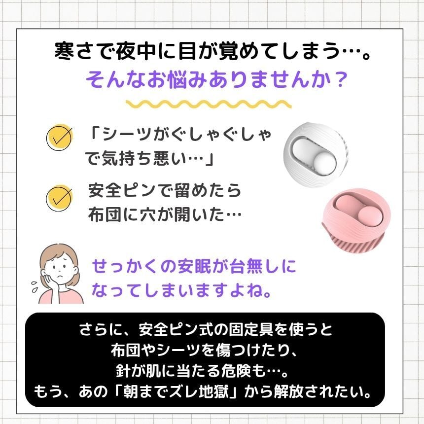 「もう寒くて夜中に目が覚めない」と話題の針なし布団クリップ。