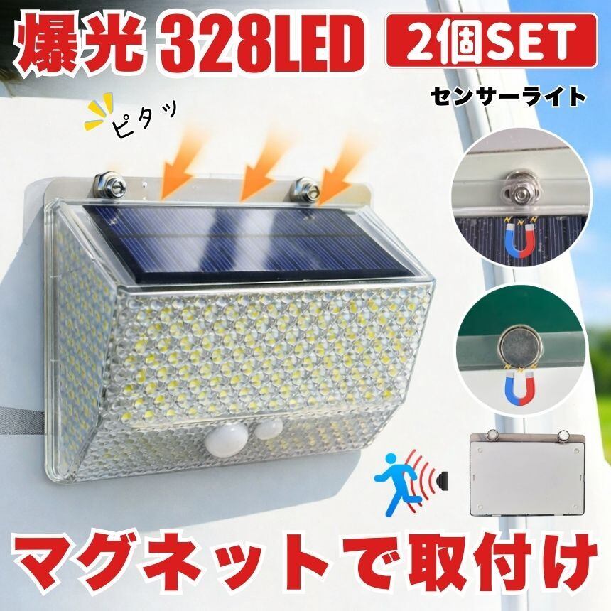 2個セット 【マグネットで取り付け可能】 ソーラーライト 屋外 防水 リモコン センサーライト ガーデンライト マグネット 磁石 ソーラーセンサーライト 防犯ライト 防災ライト 人感センサーライト 328LED LED3モード太陽光発電 玄関灯 広角 駐車場 明るい 人感センサー 送料無料