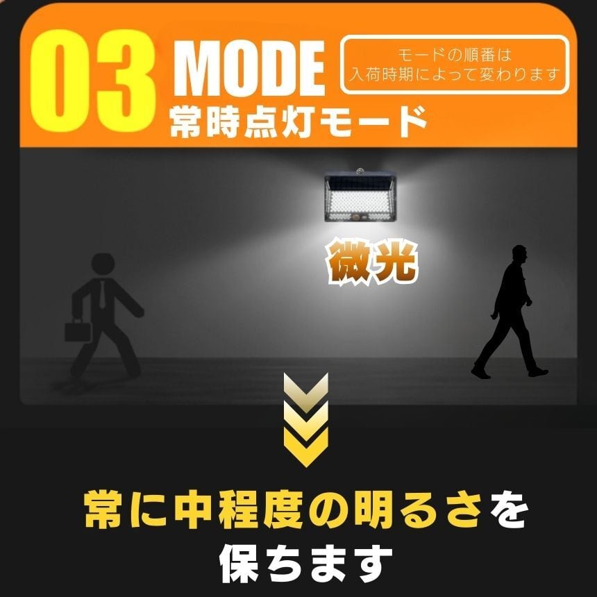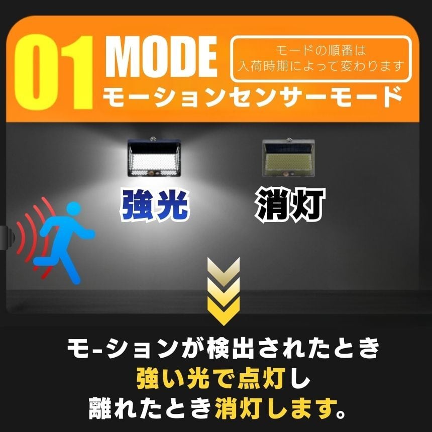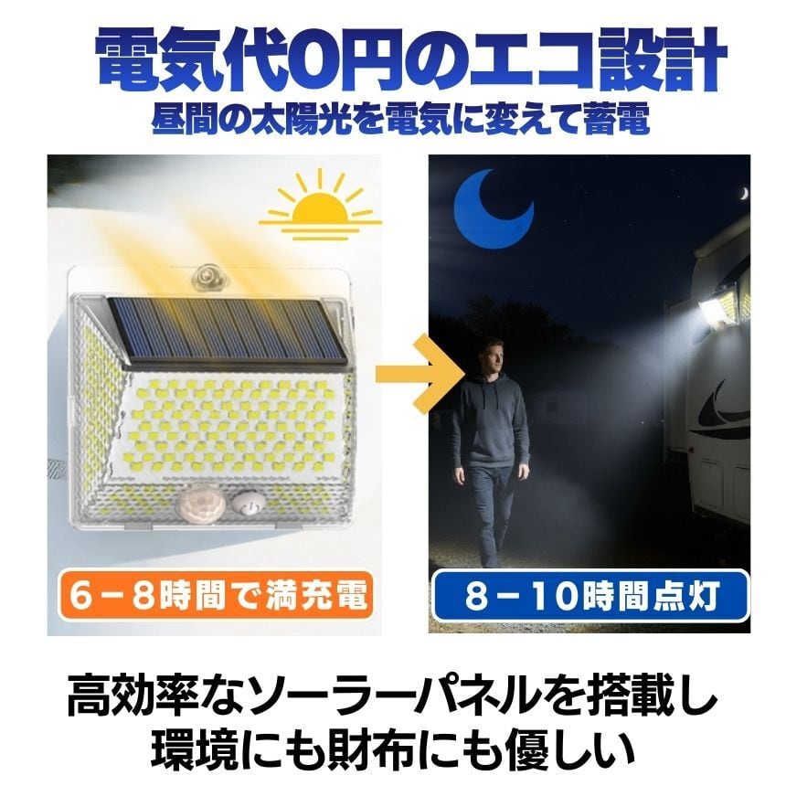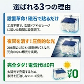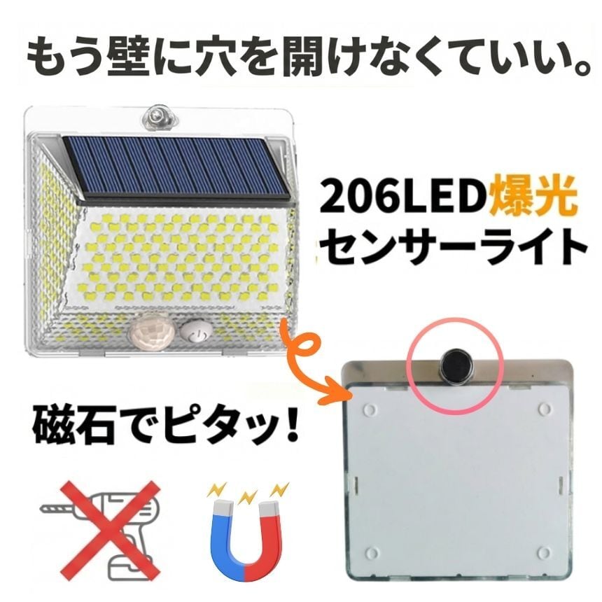 工事不要!マグネットでペタッ!206LED&4面発光ソーラーセンサーライト<br>「防犯対策をしたいけど、壁に穴を開けるのは抵抗がある…」<br>「暗い玄関や駐車場で、手軽に使えるライトが欲しい」<br><br>そんなお客様の声から生まれた<br>【背面強力マグネット搭載】の革新的なソーラーライトです。<br><br>1. 【背面磁石】で設置の常識が変わる<br>多くのソーラーライトはネジ止めが必要でしたが、<br>本品は背面に強力なマグネットを内蔵。<br>スチール製の玄関ドア<br>ガレージの支柱やシャッター<br>物置の壁面 これらへ「貼るだけ」で設置完了!<br>女性一人でも、届いたその瞬間に防犯対策をスタートできます。<br>取り外しも簡単なので、災害時の非常灯としても持ち出せます。<br><br><br>2. 【206個のLED×4面発光】<br>夜闇を昼間に変える光量<br>206個の高輝度LEDが、これまでにない爆光を実現しました。<br>左右に角度をつけた発光パネルにより、照射範囲が劇的にアップ。<br>死角になりやすい壁際までしっかり光が届くため、<br>防犯効果が極めて高く、ご家族の帰り道を優しく照らします。<br><br><br>3. 【電気代0円】<br>家計にも地球にも優しいエコ設計<br>太陽光で充電するため、面倒な配線や電池交換、電気代は一切かかりません。<br>日中太陽光に当てるだけで、夜間に必要な分だけ賢く点灯。<br>一度設置すれば、家計を助けてくれる頼もしい味方です。<br><br><br>4. シーンに合わせて選べる<br><br>【3つの知能モード】<br><br>【モード1:モーションセンサー】<br>普段は消灯、人の動きを検知すると100%の明るさで点灯。防犯に最適!<br><br>【モード2:Dim+センサー】<br>夜間は常に弱光で点灯し、人を検知すると100%の明るさに。玄関先に便利!<br><br>【モード3:常時点灯】<br>夜間、中輝度でずっと光り続けます。お庭のライトアップや作業灯に。<br><br>5. 【IP65防水・防塵】<br>過酷な屋外環境を耐え抜く<br>雨や雪、砂埃が舞う屋外でも安心。精密な防水構造により、長く愛用いただけます。<br>コンパクトながら頑丈な設計で、アウトドアやキャンプの際にも活躍します。<br><br>【こんな場所にオススメ!】<br>玄関・ポーチ: 鍵開けをスムーズに、不審者を威嚇<br>ガレージ・駐車場: 愛車の防犯、夜間の駐車サポートに<br>物置・庭: 夜間の作業やペットの散歩コースに<br>ベランダ・勝手口: 死角をなくして、住まいの安心を向上<br>「マグネット設置」がとにかく便利です!<br><br>「ここに光が欲しかった」という場所に、<br>工具なしで設置できる快感をぜひ体感してください。<br>206個のLEDによる圧倒的な明るさは、<br>一度使うと他のライトには戻れなくなるほどです。<br><br>【製品仕様】<br>商品名:背面マグネット付 206LEDソーラーセンサーライト<br>防水等級:IP65(屋外対応)<br>充電時間:直射日光で約6-8時間(季節・天候により変動)<br>付属品:取付ネジ、両面テープ<br>今すぐ、あなたのお家を「光のバリア」で守りませんか?