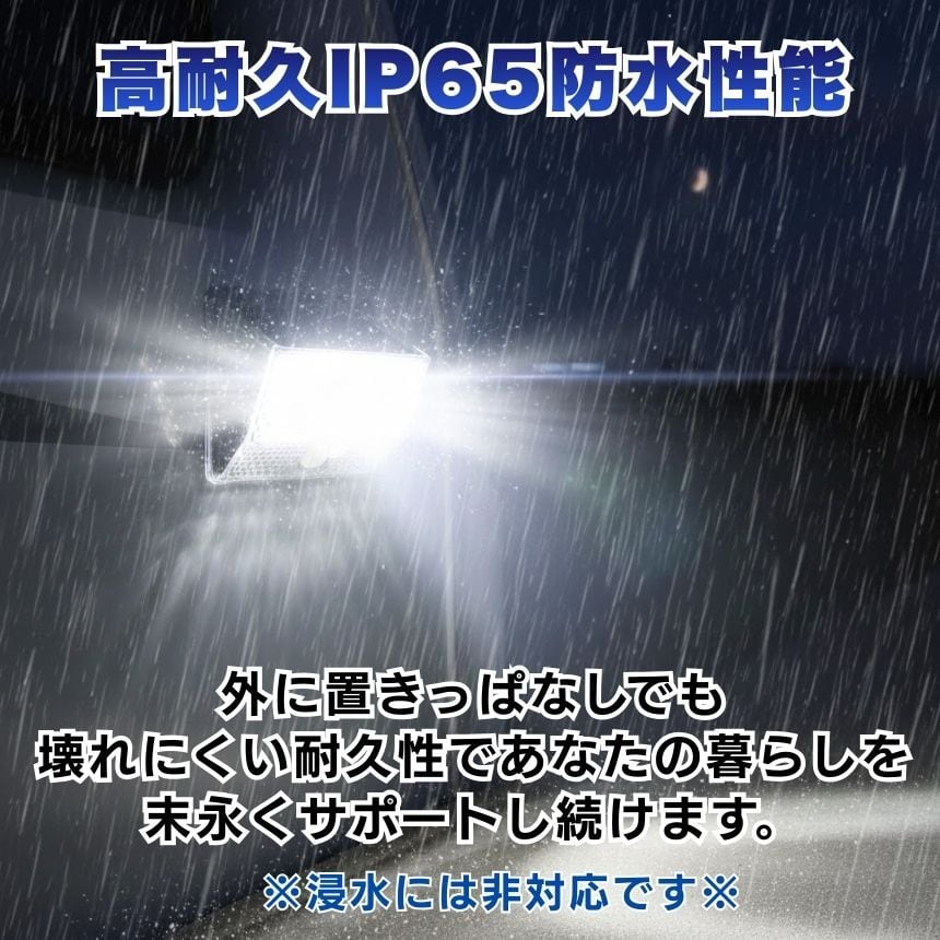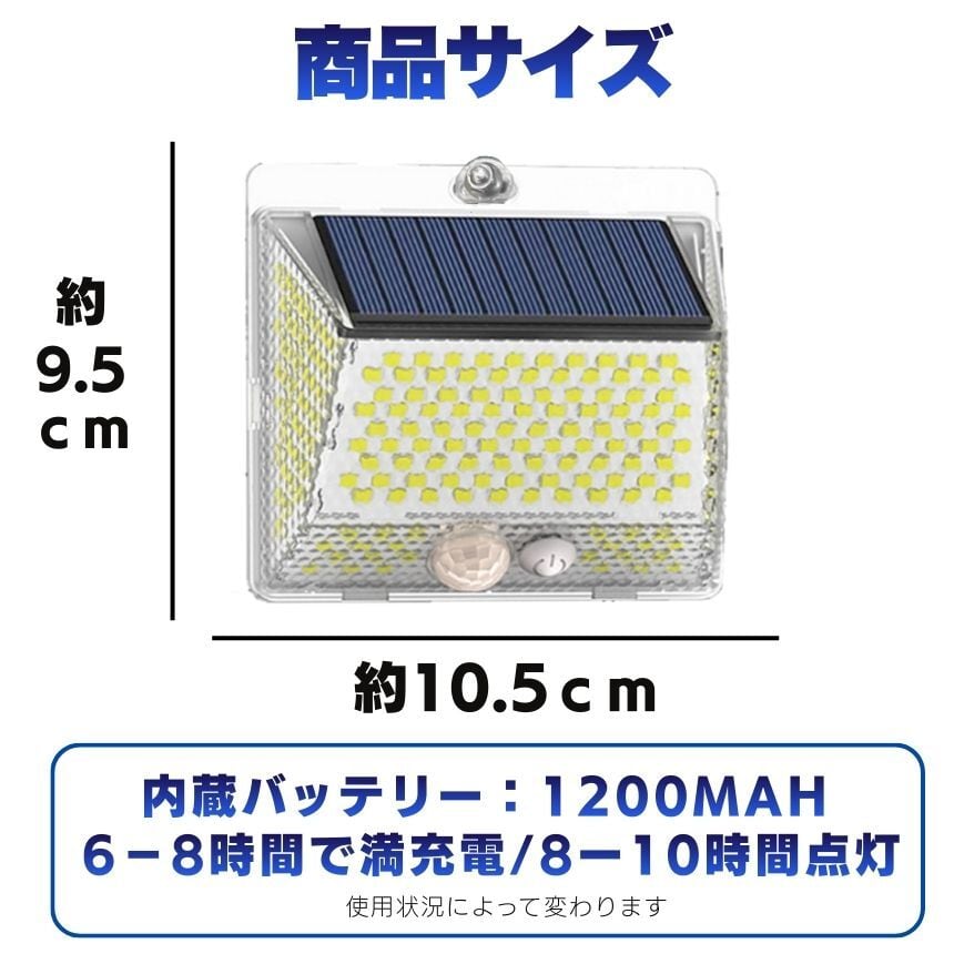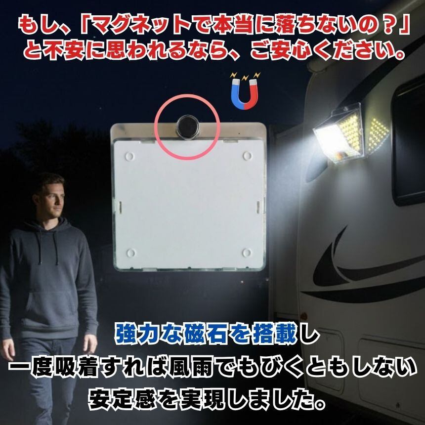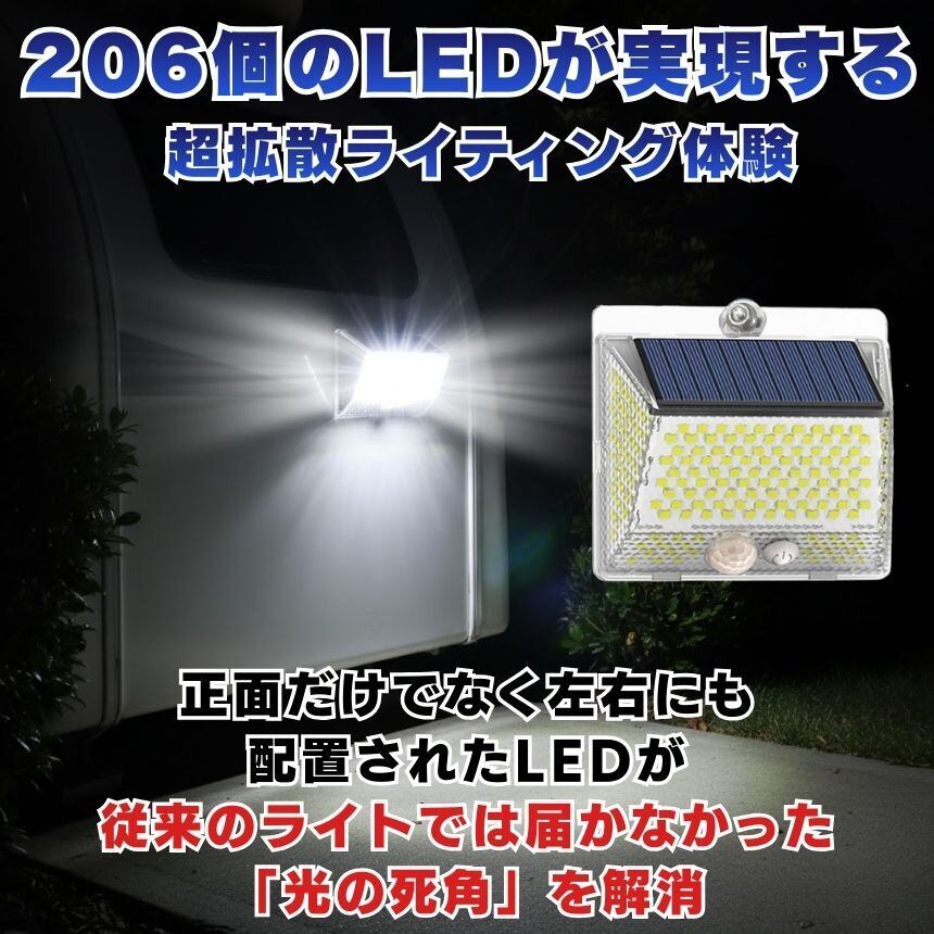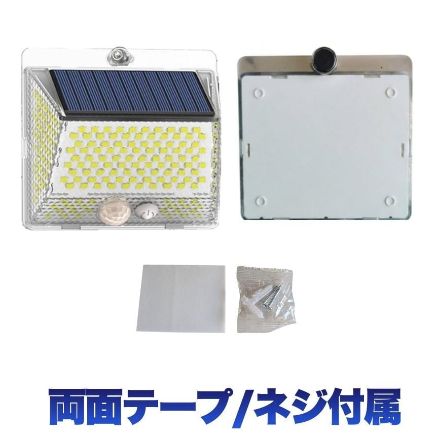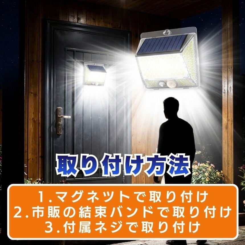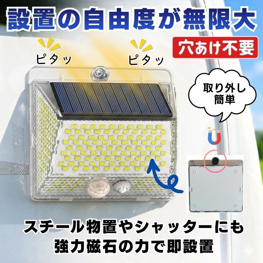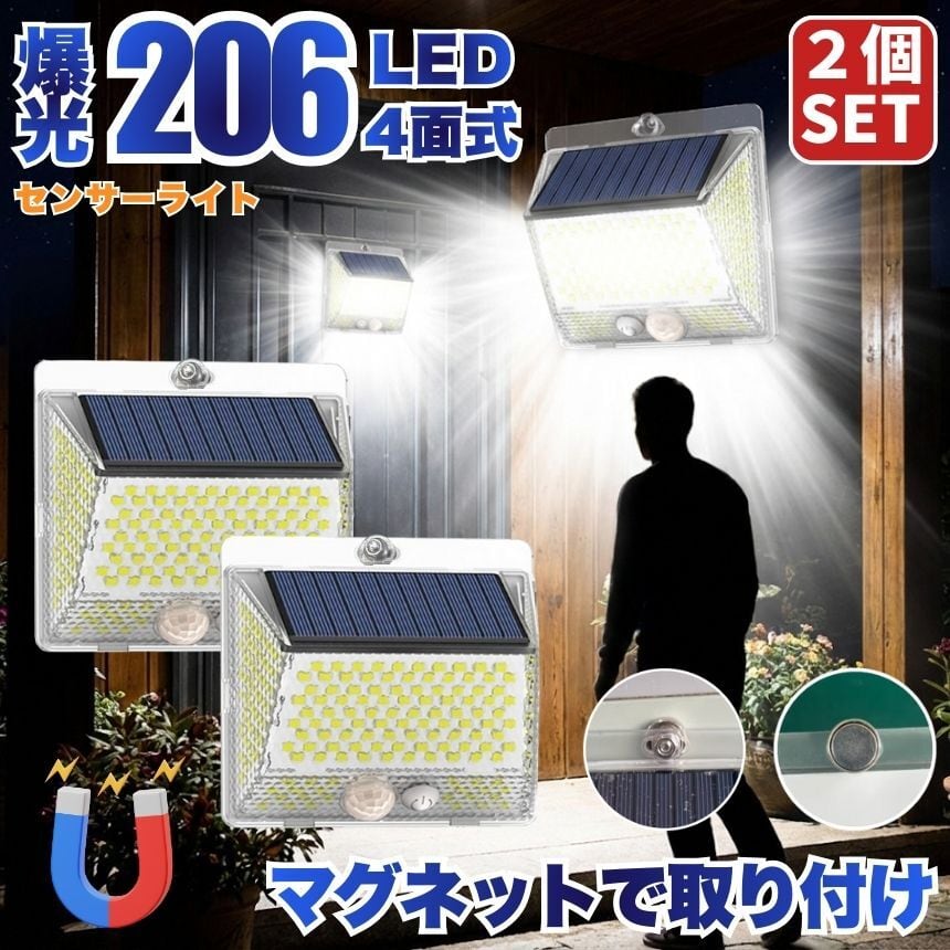 工事不要!マグネットでペタッ!206LED&4面発光ソーラーセンサーライト<br>「防犯対策をしたいけど、壁に穴を開けるのは抵抗がある…」<br>「暗い玄関や駐車場で、手軽に使えるライトが欲しい」<br><br>そんなお客様の声から生まれた<br>【背面強力マグネット搭載】の革新的なソーラーライトです。<br><br>1. 【背面磁石】で設置の常識が変わる<br>多くのソーラーライトはネジ止めが必要でしたが、<br>本品は背面に強力なマグネットを内蔵。<br>スチール製の玄関ドア<br>ガレージの支柱やシャッター<br>物置の壁面 これらへ「貼るだけ」で設置完了!<br>女性一人でも、届いたその瞬間に防犯対策をスタートできます。<br>取り外しも簡単なので、災害時の非常灯としても持ち出せます。<br><br><br>2. 【206個のLED×4面発光】<br>夜闇を昼間に変える光量<br>206個の高輝度LEDが、これまでにない爆光を実現しました。<br>左右に角度をつけた発光パネルにより、照射範囲が劇的にアップ。<br>死角になりやすい壁際までしっかり光が届くため、<br>防犯効果が極めて高く、ご家族の帰り道を優しく照らします。<br><br><br>3. 【電気代0円】<br>家計にも地球にも優しいエコ設計<br>太陽光で充電するため、面倒な配線や電池交換、電気代は一切かかりません。<br>日中太陽光に当てるだけで、夜間に必要な分だけ賢く点灯。<br>一度設置すれば、家計を助けてくれる頼もしい味方です。<br><br><br>4. シーンに合わせて選べる<br><br>【3つの知能モード】<br><br>【モード1:モーションセンサー】<br>普段は消灯、人の動きを検知すると100%の明るさで点灯。防犯に最適!<br><br>【モード2:Dim+センサー】<br>夜間は常に弱光で点灯し、人を検知すると100%の明るさに。玄関先に便利!<br><br>【モード3:常時点灯】<br>夜間、中輝度でずっと光り続けます。お庭のライトアップや作業灯に。<br><br>5. 【IP65防水・防塵】<br>過酷な屋外環境を耐え抜く<br>雨や雪、砂埃が舞う屋外でも安心。精密な防水構造により、長く愛用いただけます。<br>コンパクトながら頑丈な設計で、アウトドアやキャンプの際にも活躍します。<br><br>【こんな場所にオススメ!】<br>玄関・ポーチ: 鍵開けをスムーズに、不審者を威嚇<br>ガレージ・駐車場: 愛車の防犯、夜間の駐車サポートに<br>物置・庭: 夜間の作業やペットの散歩コースに<br>ベランダ・勝手口: 死角をなくして、住まいの安心を向上<br>「マグネット設置」がとにかく便利です!<br><br>「ここに光が欲しかった」という場所に、<br>工具なしで設置できる快感をぜひ体感してください。<br>206個のLEDによる圧倒的な明るさは、<br>一度使うと他のライトには戻れなくなるほどです。<br><br>【製品仕様】<br>商品名:背面マグネット付 206LEDソーラーセンサーライト<br>防水等級:IP65(屋外対応)<br>充電時間:直射日光で約6-8時間(季節・天候により変動)<br>付属品:取付ネジ、両面テープ<br>今すぐ、あなたのお家を「光のバリア」で守りませんか?