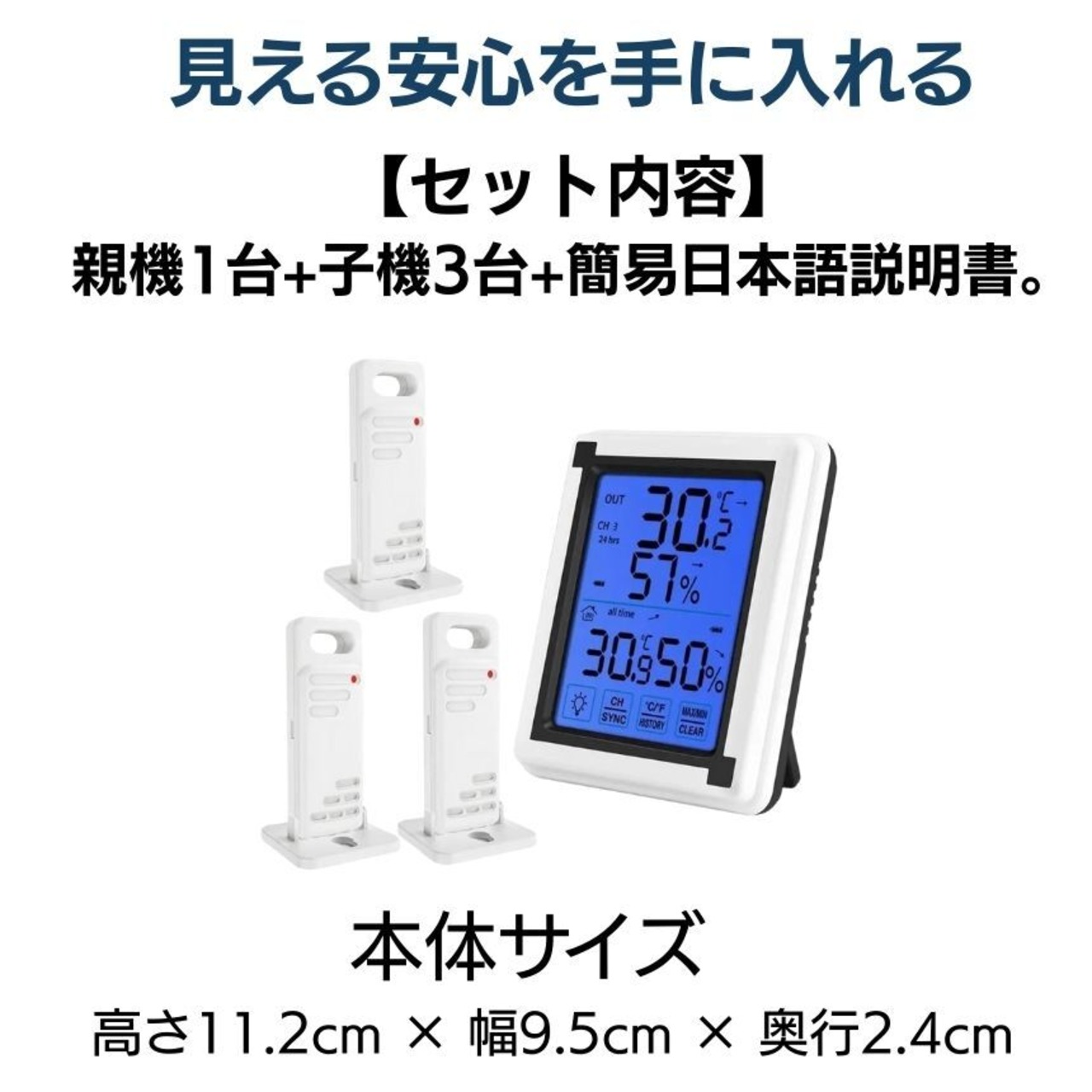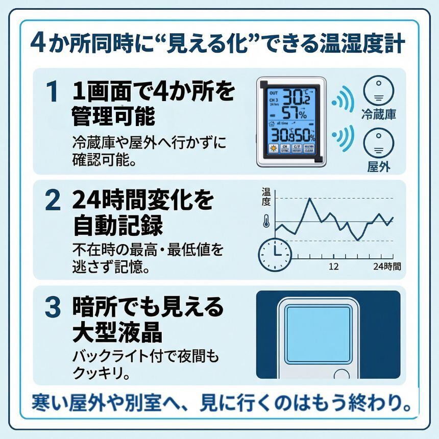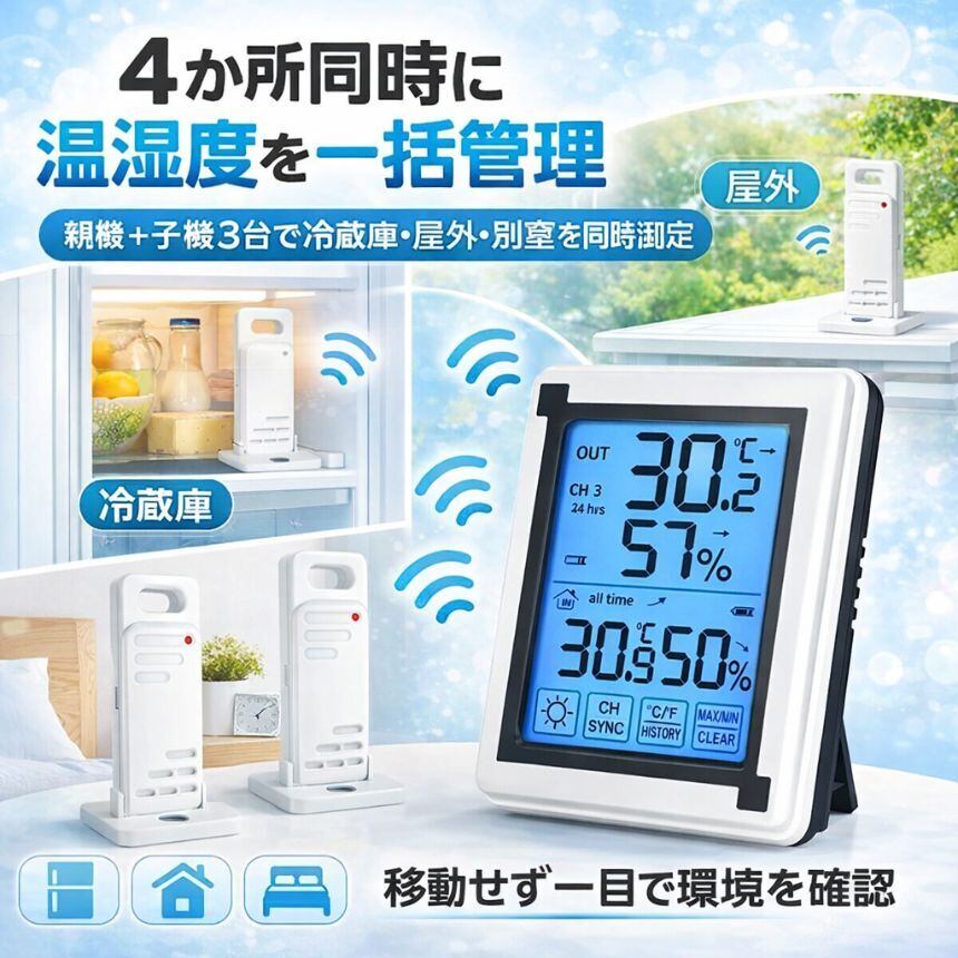 【室内外を同時に測定】無線接続の親機+子機3台