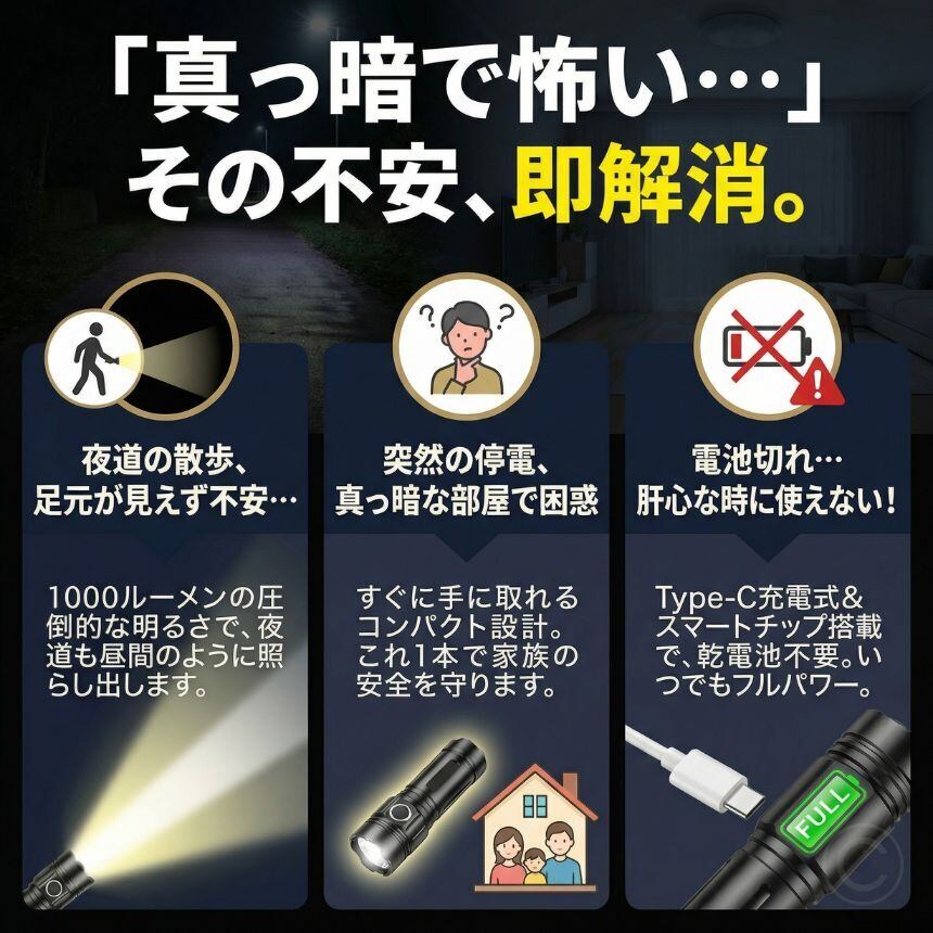 コンパクトながら実用性を重視したこのLED懐中電灯で、暗闇への不安を少し減らす準備を始めてみませんか。