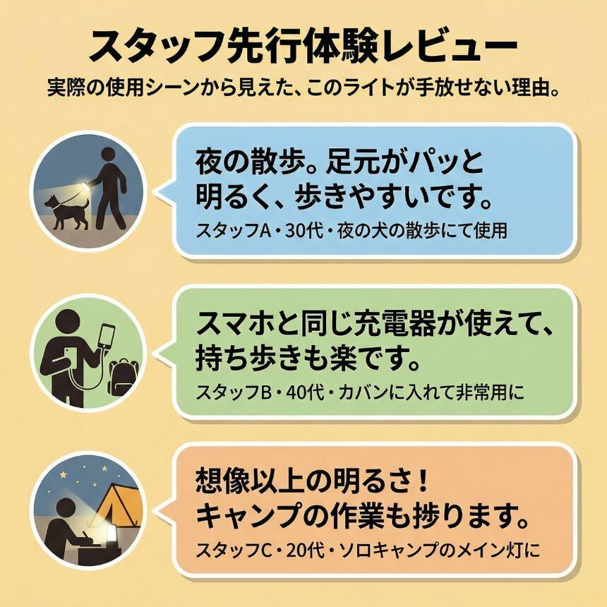 屋外だけでなく、家庭内でのちょっとした作業や車の点検時にも役立ち、「持っていてよかった」と感じる場面が多いのが特長です。