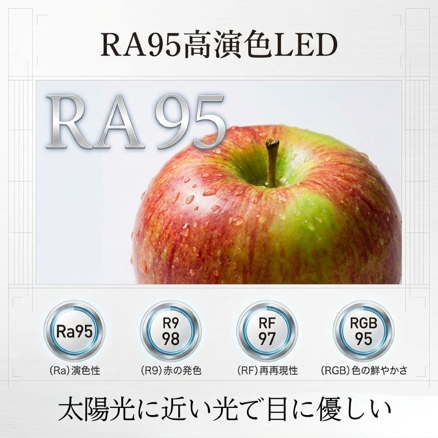 本製品はRA95の高演色LEDを採用し、太陽光に近い自然な色味を再現。