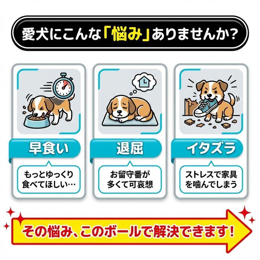 そんな愛犬家の悩みから生まれたのが、遊びながら食べられる新発想の【知育トイ】です。