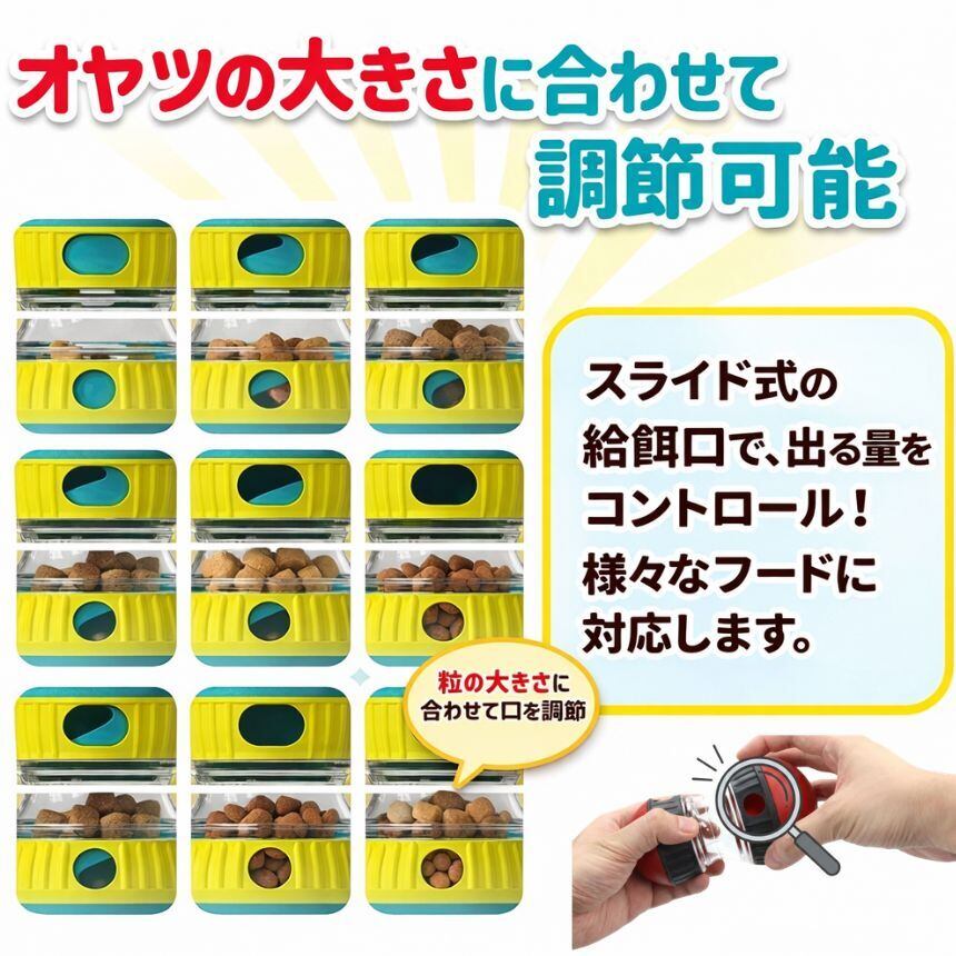 フードの粒の大きさや愛犬の性格に合わせて、給餌口のサイズを調節可能。