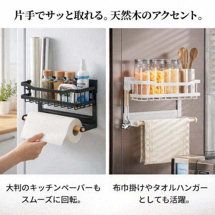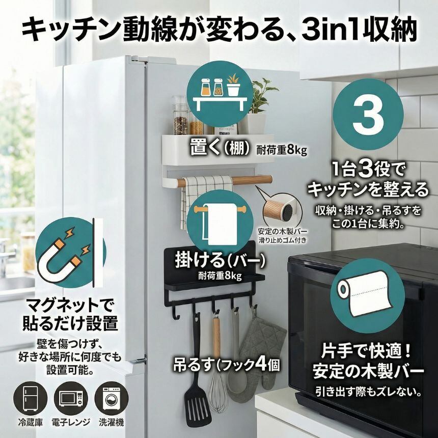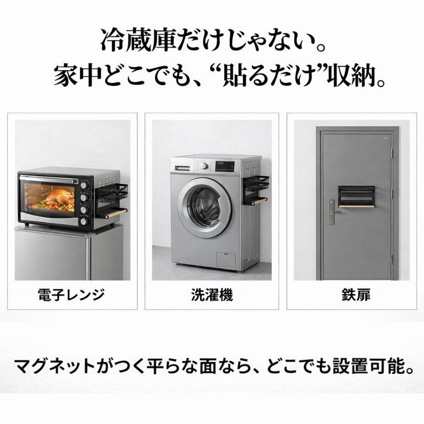 強力マグネットで冷蔵庫や電子レンジ、鉄製扉にピタッと固定。