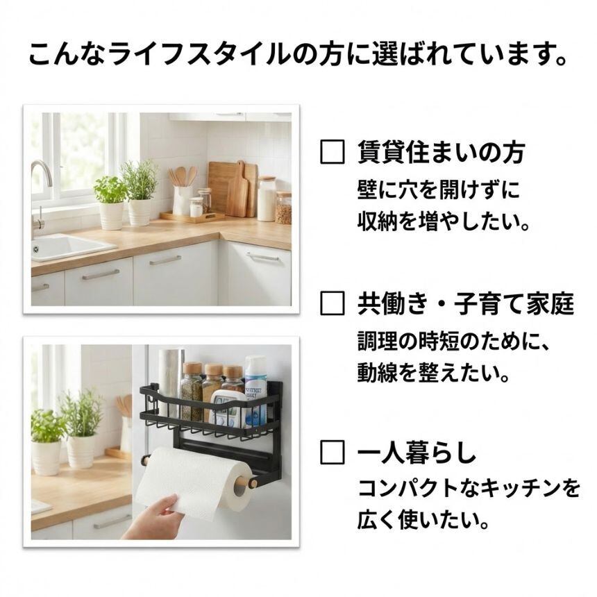 単なる収納棚ではなく、キッチン動線そのものを整えるラックです。