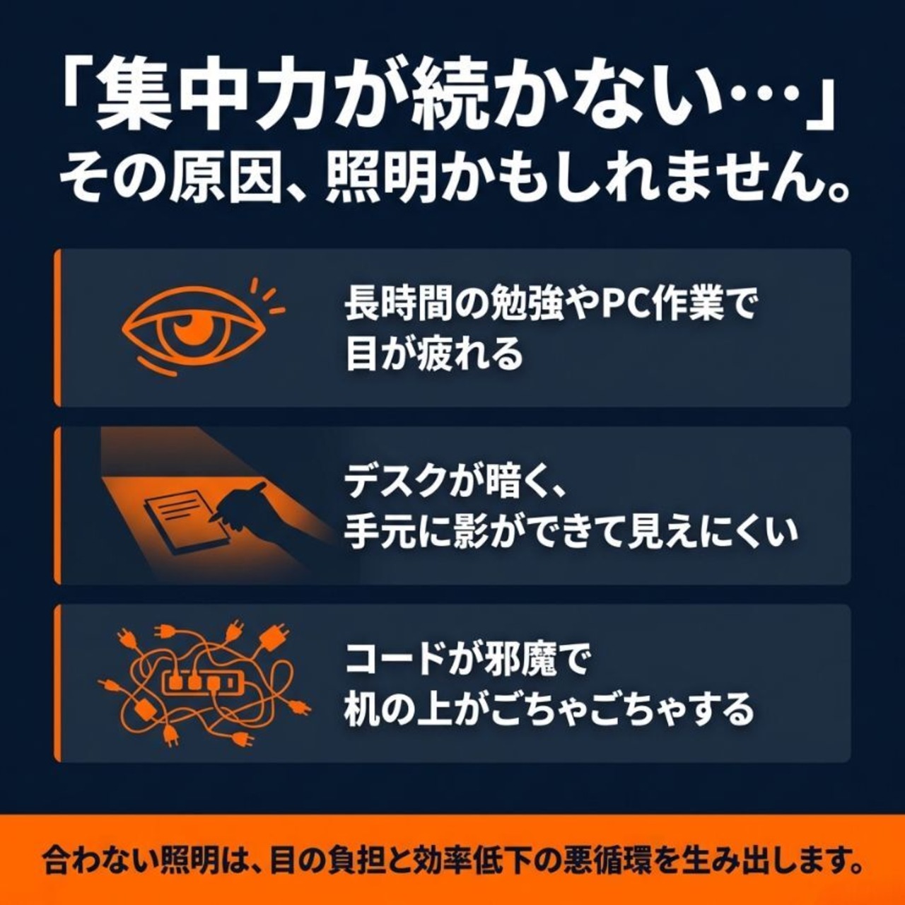 集中力や作業効率に大きく影響します。