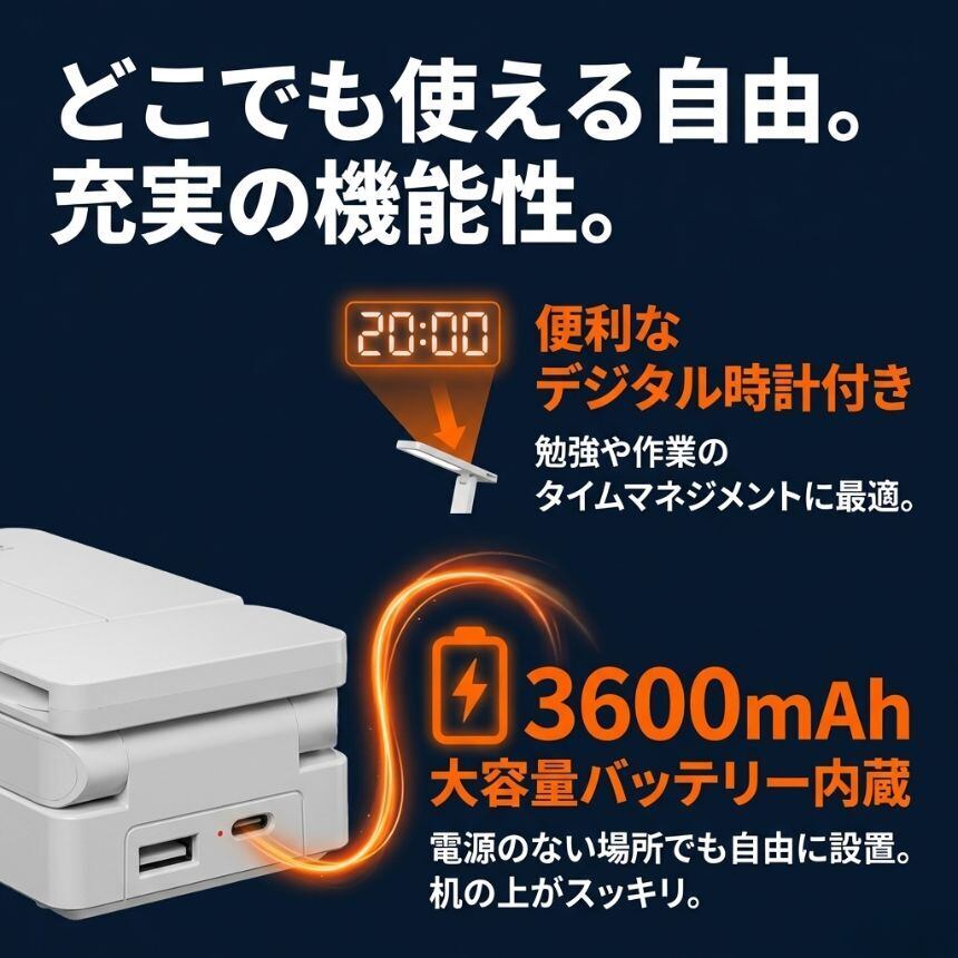 2個セット デスクライト コードレス 折りたたみ 折り畳み USB 充電式 テーブルランプ デスクスタンド ライト 照明 間接照明 学習机 おしゃれ 充電式 持ち運び LED 目に優しい 明るい 時計 クロック 明るさ調整 調光 調色 クリップ 子供 勉強 省スペース 360度回転 スタンドライト