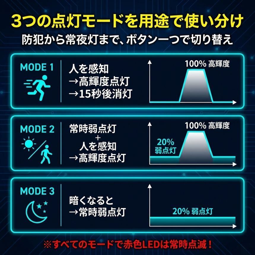 120°の人感センサーを搭載し、動きを瞬時に検知。さらに用途に応じて選べる3モードを搭載しています。