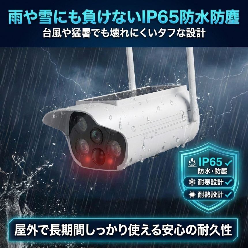 IP65の防水・防塵設計により、大雨や雪、台風でも問題なく使用可能。長期間、屋外で安心して使えます。