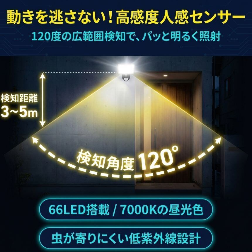 発光効率の高い66LEDを搭載し、7000Kの昼光色で周囲をしっかり照らします。さらに低紫外線設計により虫が寄りにくく、屋外でも快適に使用可能です。