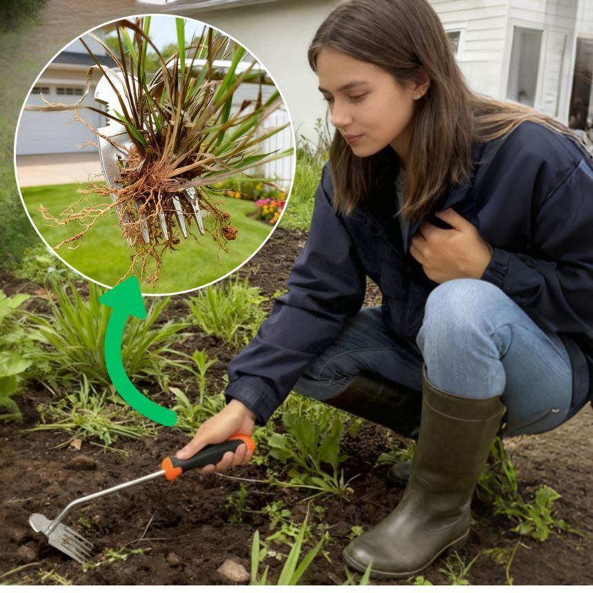 この根抜き除草ツールは、5本の鋭い歯が雑草の根にしっかり食い込み、