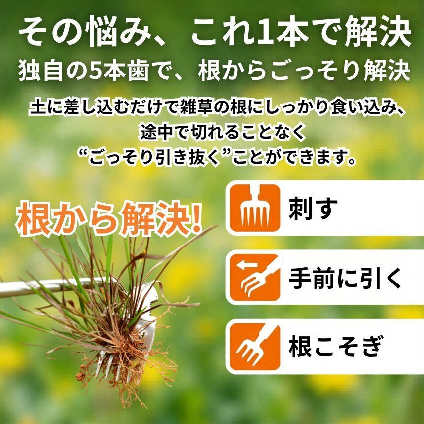 この根抜き除草ツールは、5本の鋭い歯が雑草の根にしっかり食い込み、