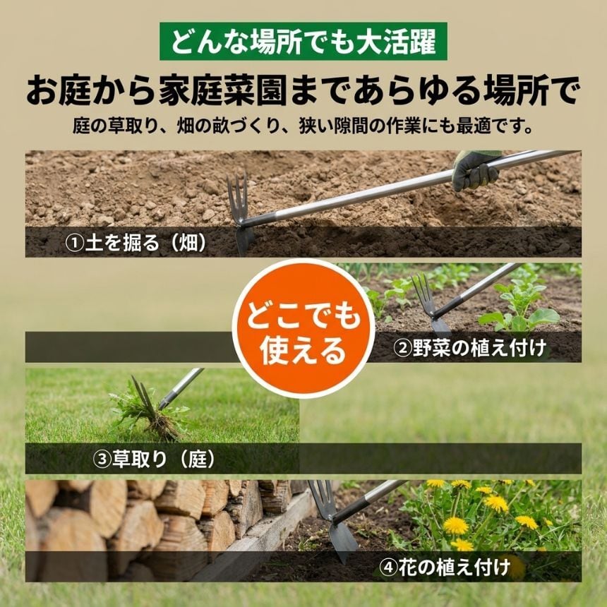 複数の園芸工具を揃える必要がなく、収納スペースの節約にもつながります。家庭菜園や庭づくりに最適な園芸ツールです。