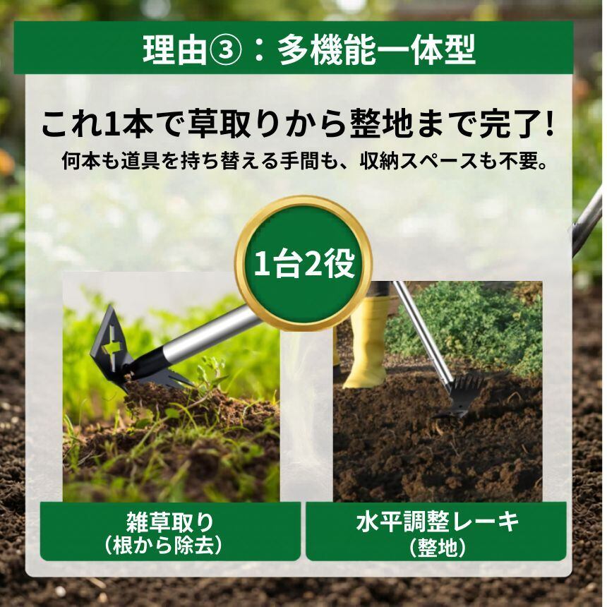 この草取り道具は、除草・整地・耕運を1本でこなす多機能設計です。