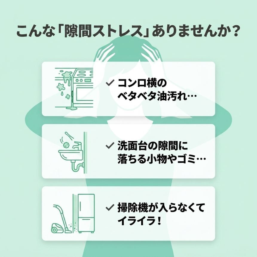壁の隙間にぴったりフィットで、水はねやホコリ、小物の落下を防ぐことができます。