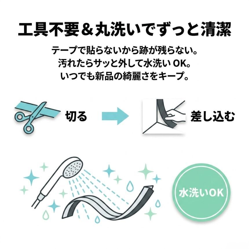 洗面台 隙間パッキンは、水はねやすい洗面台の隙間に取り付けるのに最適で、水はねやホコリ、小物の落下を防ぐことができます。