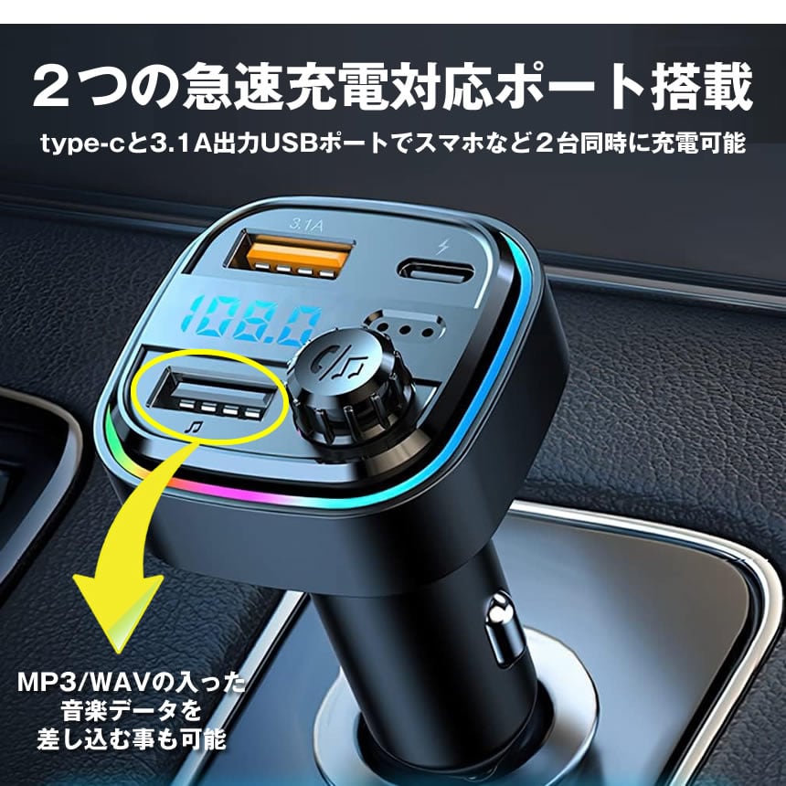 FMトランスミッター bluetooth トランスミッター ブルートゥース マイク 12V 24V シガーソケット USB 増設 充電器 ライト カーオーディオ type-c 急速充電