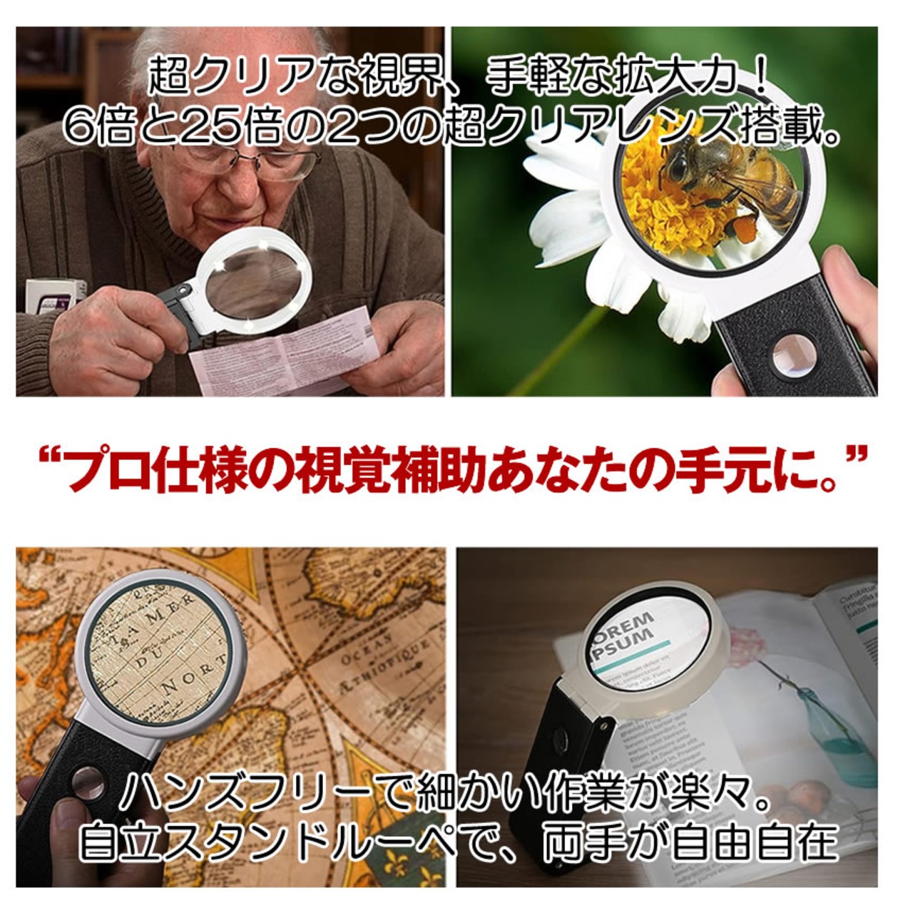【 6倍 & 25倍 & UV紫外線ライト 】 拡大鏡 ルーペ スタンド 手持ちルーペ スタンドルーペ ライト付き ブラックライト 折りたたみ 折り畳み デスクルーペ 老眼鏡 虫眼鏡 自立 ハンズフリー 読書用ルーペ 手芸 ネイル 模型 プラモデル フィギュア 読書 照明