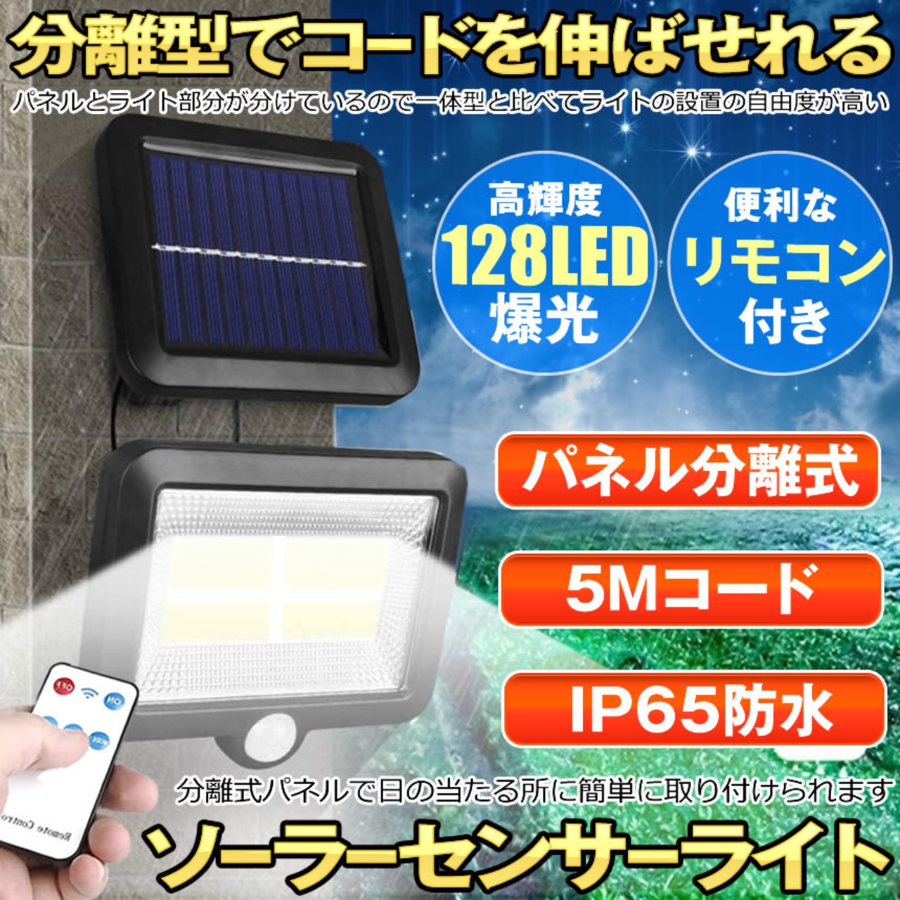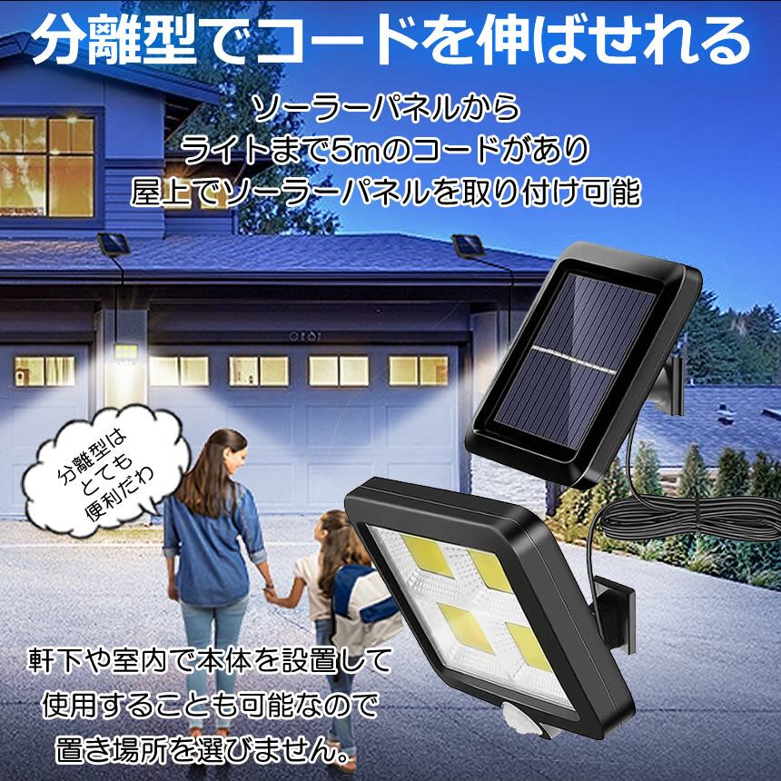 ソーラーライト 屋外 防水 2台セット リモコン 分離型 ソーラーセンサーライト ガーデンライト 庭 センサー 明るい パネル 5Mコード 防犯 ライト 壁掛け 128LED