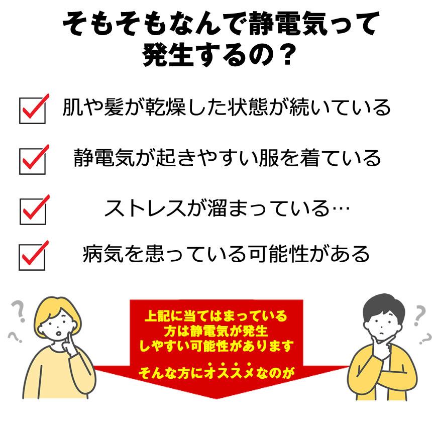 また、静電気が蓄積されることで、健康が損なわれてしまうこともあります。