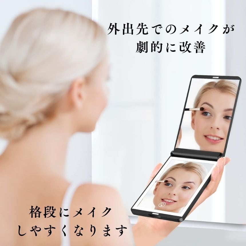調光可能なLEDライトが搭載しており、顔全体を均等に照らし、影をなくし、化粧ムラ防止になります。メイクに十分な明るさがあるので、暗い場所でもスムーズにメイクアップできます。