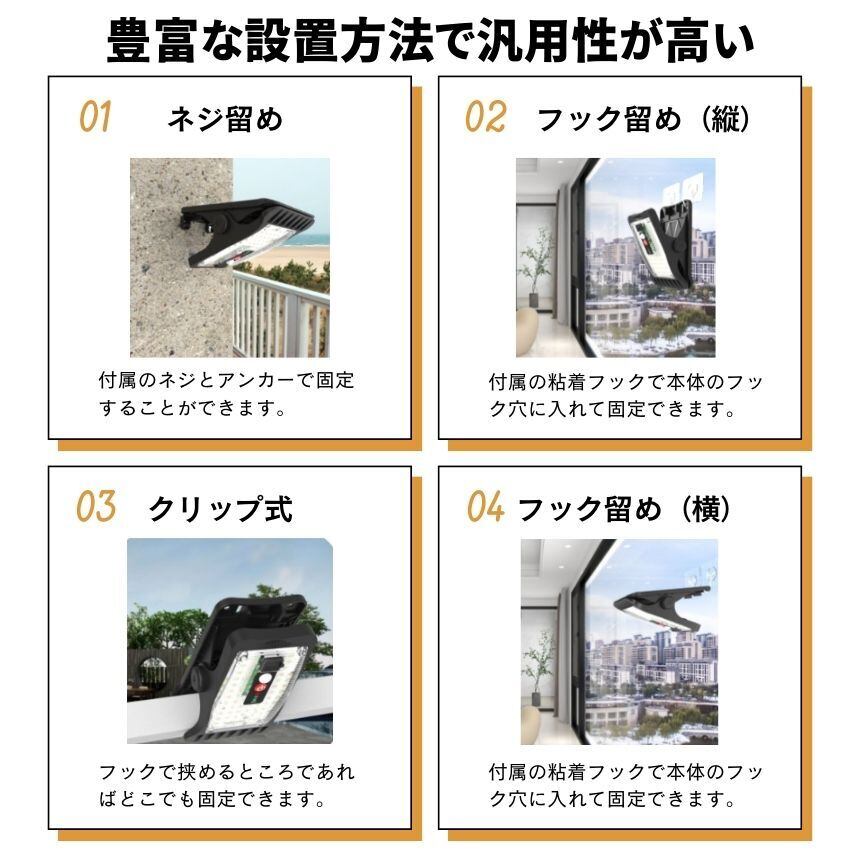 【配線不要・設置簡単・幅広い用途】ソーラータイプ式なので、配線不要、取り付けはとても簡単です。安心に屋外の車道、歩道、庭、軒先、壁掛け、玄関周りなどに設置出来ます。また、クリップ式なので、物干し竿、キャンプのロープ、椅子などに簡単に挟むことができます。様々な場所で使える。