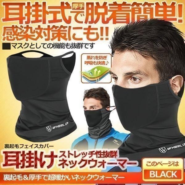 耳掛けネックウォーマーマスク ブラック 防寒 フェイスカバー 裏起毛 厚手 防風 息苦しくない バイク MIMINEKUW-BK