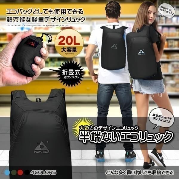 エコリュック エコバッグ 折りたたみ リュック 折畳みバッグ リュックサック 超軽量 大容量 20L 防水 ブラック 折畳み かばん 鞄 旅行 買い物 アウトドア