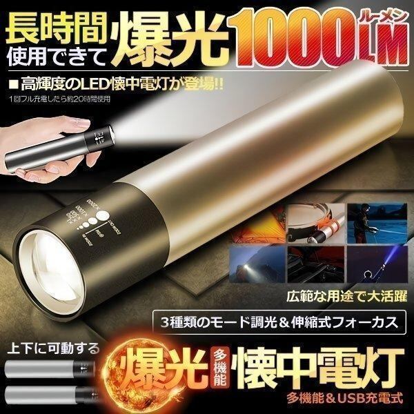 懐中電灯 led 強力 充電式 ハンディライト 爆光 1000LM 小型 高輝度 ledライト ズーム ハンディ 軽量 軍用 防水 明るい 防災 登山 夜釣り用 キャンプ アウトドア