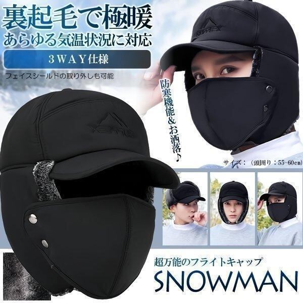 裏起毛 3WAY 防寒キャップ 耳あて付 マスク 防寒 スノー 作業 雪 フライトキャップ 帽子 保温 マスク付き 寒さ対策 防風 男女兼用 SNOWWM