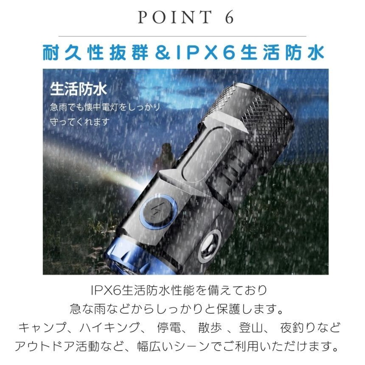 キャンプ、ハイキング、 停電、 散歩 、登山、 夜釣りなどアウトドア活動など、