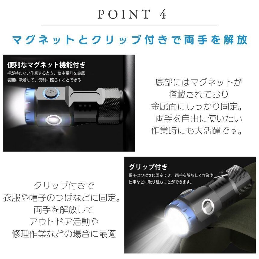 【 マグネット 付き 】 懐中電灯 充電式 小型 ハンディライト led ライト 最強 フラッシュライト ハンディ 高輝度 USB TYPE-C 作業 防水 持ち運び 軽量 ワーク ウォーキング キャンプ ジョギング 夜釣り 釣り 防犯 防災 災害 グッズ 登山 散歩 夜釣り 停電対策