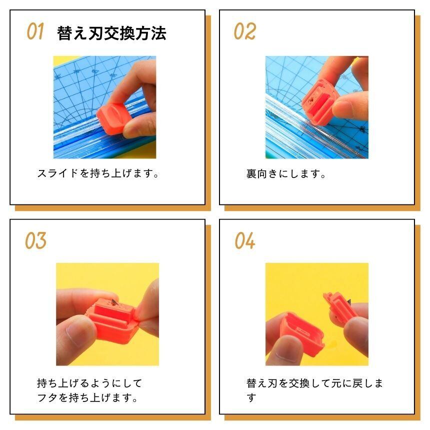【替え刃付き】替え刃が5本付きで刃が鈍くなると簡単に交換可能です。印刷用紙、写真用紙、カード用紙などの一般的な用紙は簡単にカットできます。