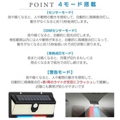このソーラーセンサーライトは、190個の高輝度LEDを搭載し、正面と両側の3方向に広がる光で、最大限の照明範囲を確保します。家庭やオフィス、庭、駐車場など、あらゆる場所で安心・安全をサポートする万能ライトです。さらに、赤と青のフラッシュライトを備えた警告モードを搭載し、防犯対策にも最適です。