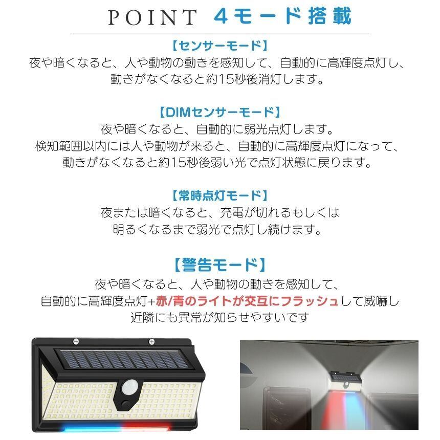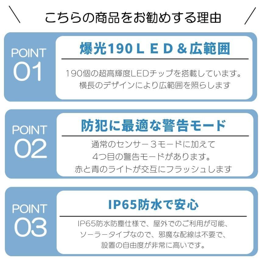 【 警告モード 】 ソーラーライト センサーライト 屋外 防水 ガーデンライト 人感センサーライト 明るい 190LED ソーラーセンサーライト LEDライト 人感センサー 防犯 ライト 防災 LED 夜間 照明 玄関 駐車場 赤 青 点滅 広角