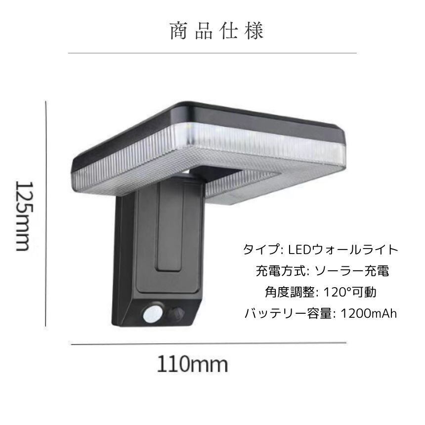 調整機能: 照明角度120°、ソーラーパネル回転