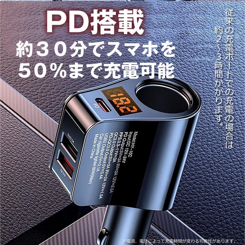 シガーソケット カーチャージャー USB 充電器 電圧計 増設 急速 充電 USBポート PD QC3.0 車 急速充電 車載充電器 スマホ スマートフォン タブレット Android アンドロイド アイフォン ドラレコ ドライブレコーダー カーナビ 12V 24V シガーライター